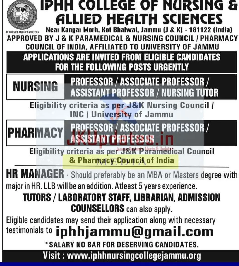 The IPHH College of Nursing & Allied Health Sciences, Jammu, a premier institution recognized by the J&K Paramedical & Nursing Council and affiliated with the University of Jammu, has announced multiple job openings for academic and administrative positions. This recruitment drive is a golden opportunity for qualified professionals in nursing, pharmacy, and human resources to join a reputed institution known for its state-of-the-art infrastructure, distinguished faculty, and strong placement record.
